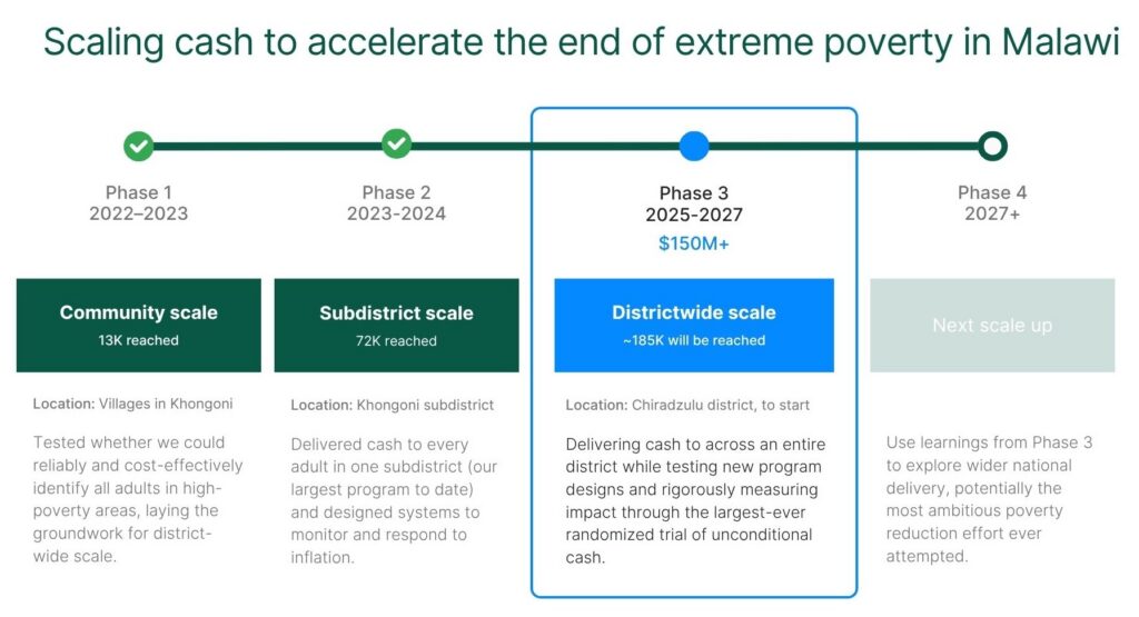 🇲🇼 We’ve launched our most ambitious program and research yet, delivering funds across an entire district in Malawi, reaching over 185k people and studying the impacts with the largest-ever randomized trial on unconditional cash.
