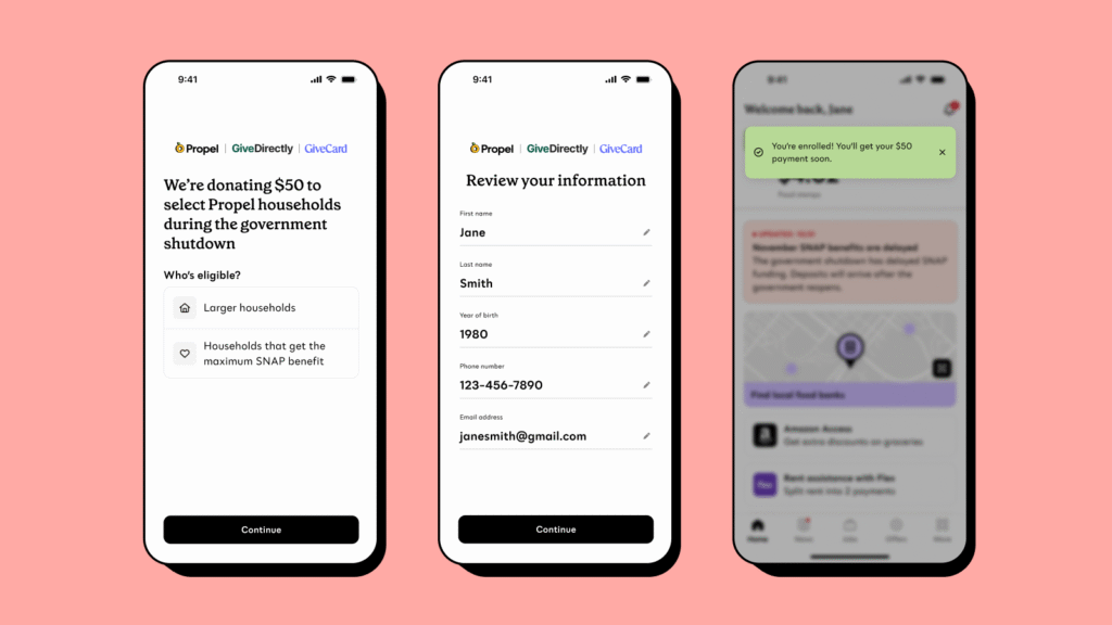 GiveDirectly and Propel, an app used by millions of SNAP households to manage their benefits, partner to send emergency cash to Americans in need — most recently in response to the SNAP benefit delays.